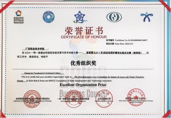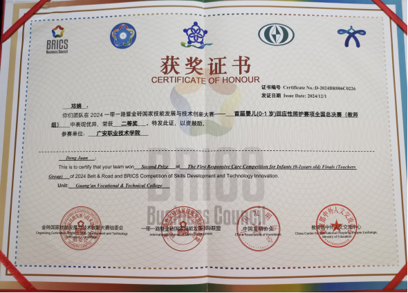 11月28日-12月1日,2024一带一路暨金砖国家技能发展与技术创新大赛——全国首届婴儿(0-1岁)回应性照护赛项(全国总决赛)在内蒙古自治区兴安盟市举行,kaiyun中国官方网站教师邓娟喜获教师组二等奖。