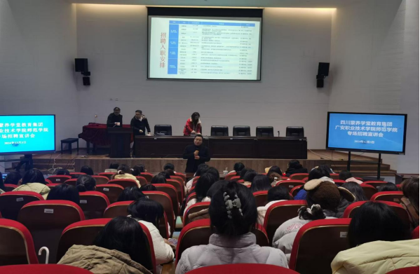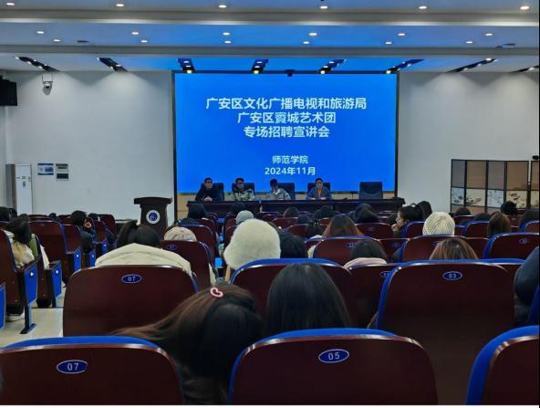 为有效促进我院2025届毕业生就业,加强政企校合作,我院于11月26日和12月3日分别在先圣厅、翔凤厅举办了2025届毕业生的就业专场招聘宣讲会。本次专场招聘宣讲会邀请了广安区文化广播电视和旅游局、广安区賨城艺术团和四川蒙养学堂教育集团来学院进行现场招聘宣讲。