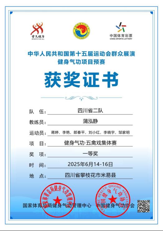 与此同时,专业教师在高水平赛事指导中再添亮眼成绩。2025 年 6 月,kaiyun社会体育专业教师蒲泓静受四川省社会体育指导中心聘请,以教练员身份指导四川省二队,参与中华人民共和国第十五届运动会群众展演健身气功项目预赛。在其专业指导下,四川省二队在健身气功・五禽戏集体赛中表现出色,斩获一等奖,成功入围决赛,充分展现了kaiyun教师在体育专项指导领域的过硬专业素养。