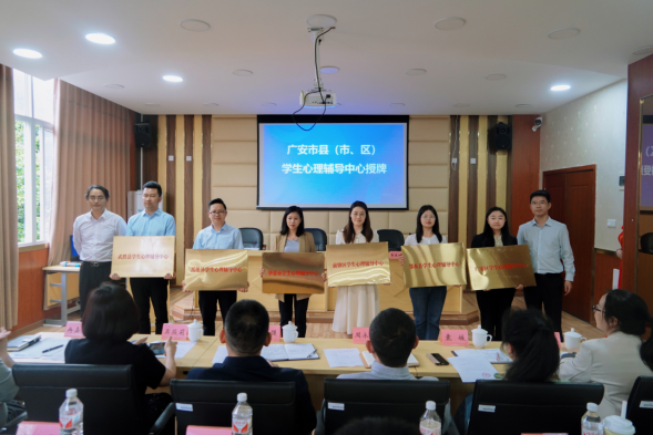 仪式现场,市教体局宣读了《关于成立四川学生心理健康教育研究中心(广安分中心)的通知》,与会领导共同为分中心揭牌,并向6个县(市、区)心理健康辅导中心授牌,标志着覆盖全域的"家校社协同"心理健康服务体系正式启动。